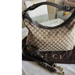 Bolsa confeccionada em canvas gg e com acabamento em 100 couro. Ferragens em prata com a marca gucci, medindo a12xl37xp17 e porta bolsa em algodão. Semi nova e em excelente estado de conservação.