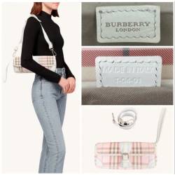Bolsa burberry original modelo check baguette em canva clássico da marca na cor rosa, couro branco e alça em tecido branco. Alça de ombro removível. Possui alça pra clutch. Em perfeito estado de conservação. Medidas altura 11cm largura 26cm alça 49cm regulável
