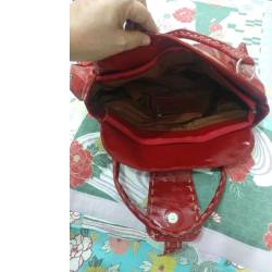 Linda bolsa vermelha em verniz com pespontado em linha marrom, bem espaçosa, está perfeito estado de conservação