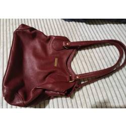 Feminina, couro, vermelho, de ombro. Três compartimentos e vários bolsos internos.